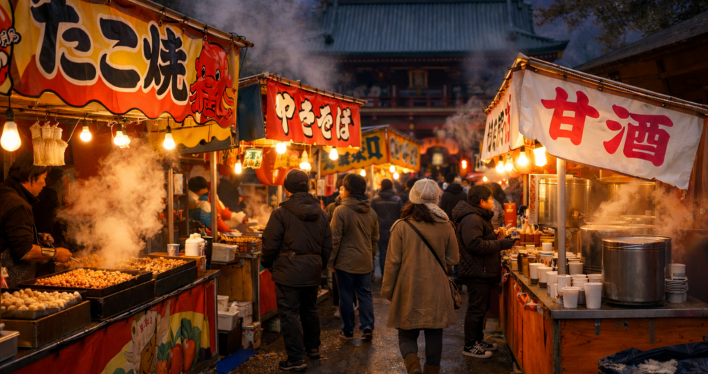 見どころ② 冬ならではの楽しみ!屋台で味わう「食べ歩き」🍡
